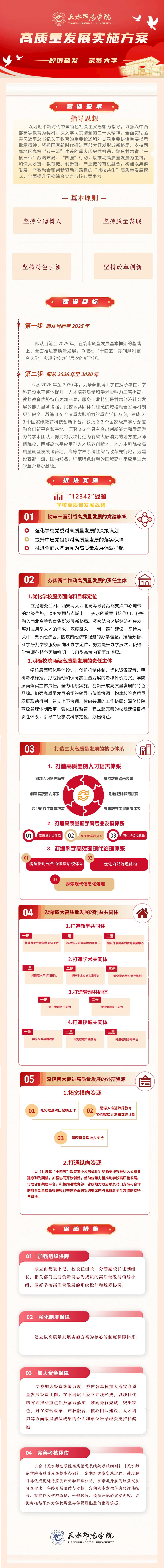 《方案》提出,公司高质量发展将坚持立德树人、坚持质量发展、坚持特色引领、坚持改革创新等基本原则。全面贯彻党的教育方针,坚持三全育人,五育并举,着力培养具有国家使命感和社会责任感、富有创新精神和实践能力的优秀人才;立足高质量发展这一核心,瞄准一流水平,聚集重大成果,汇聚优质资源,精准发力,务求实效;发挥天水地处兰州、西安两大西部高等教育重要战略支点中心的地缘优势,积极融入高等教育新发展格局,坚持错位竞争发展思路,有所为有所不为,有先为有后为,以打造学科专业特色为着力点,形成公司的品牌优势;坚定不移全面深化改革,以落实教育评价改革为切入点,找准改革的发力点和推进路径,破除制约公司发展的深层次矛盾,传递压力,激发活力,汇聚发展新动能。